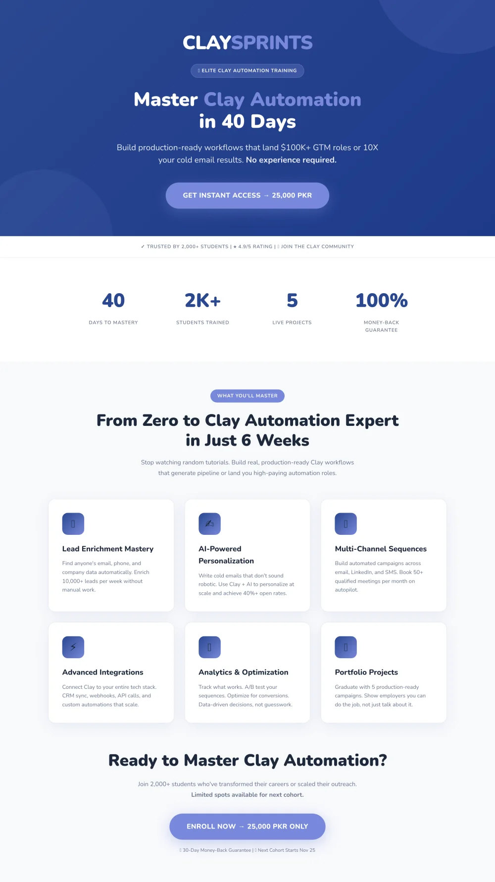 Perfect for professionals who want to master Clay automation and earn $1,000-$2,000+/mo with AI-powered workflows.